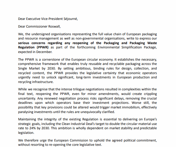 Joint Call to Protect the Integrity of the Packaging and Packaging Waste Regulation