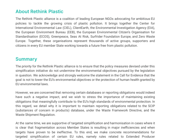 The priority for the Rethink Plastic alliance is to ensure that the policy measures devised under this simplification initiative do not undermine the environmental objectives pursued by the legislation in question. We acknowledge and strongly welcome the statement in the Call for Evidence that the goal is not to lower the EU’s environmental objectives or the protection of human health granted by EU environmental laws.